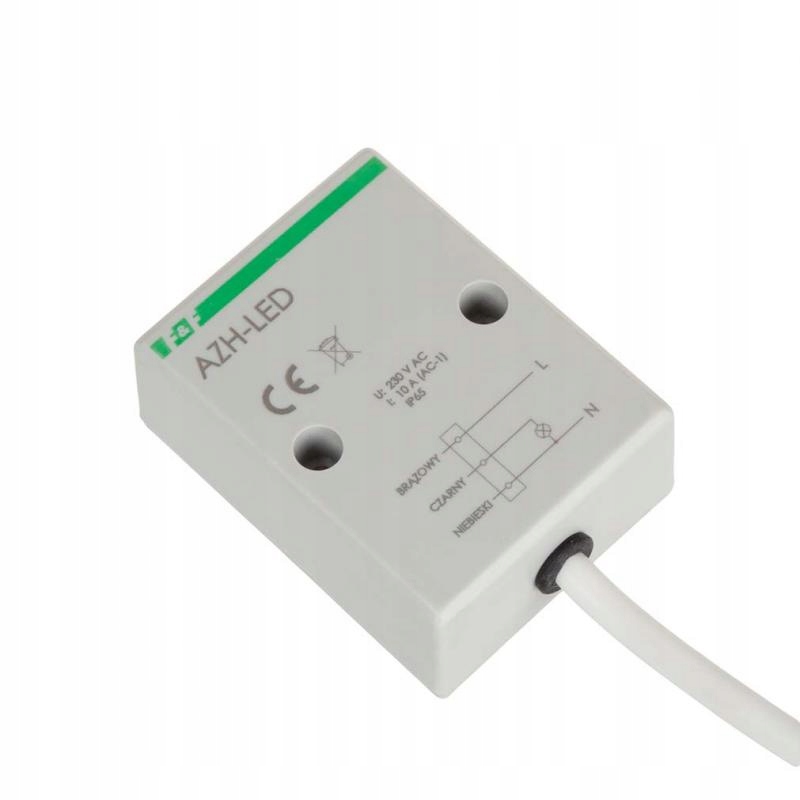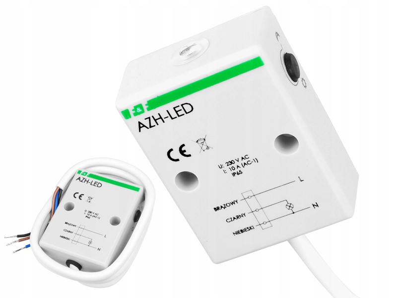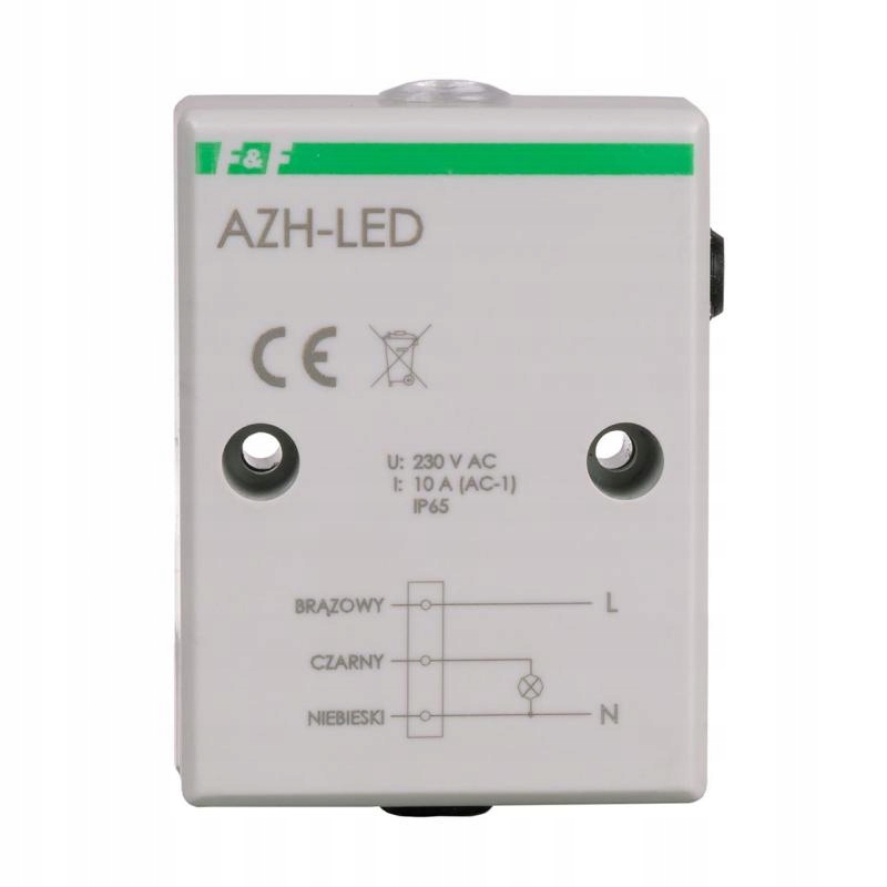 AZH-LED to automat zmierzchowy z wbudowanym czujnikiem światła. Posiada hermetyczną obudowę. Jest przystosowany do załączania oświetlenia LED. Zawdzięcza to zastosowaniu elementu przełączającego, który gwarantuje poprawną pracę przy impulsach prądowych do 160 A /20 ms. Został również wyposażony w dodatkowe elementy odpowiedzialne za gaszenie przepięć. Czynniki te powodują, że czujnik zmierzchu AZH-LED z powodzeniem załącza i wyłącza oświetlenie LED. Przystosowanie automatu do współpracy z LEDami jest istotne, ponieważ mimo swojej energooszczędności oświetlenie LED generuje w momencie załączenia silne udary prądowe. Udary te niszczą klasyczne przekaźniki.