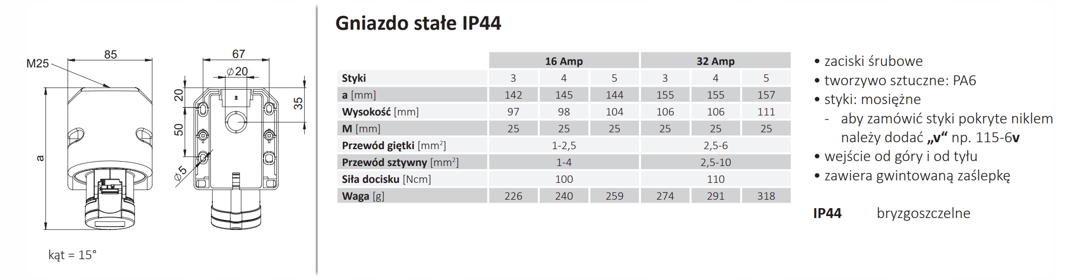 Gniazdo stałe siłowe 16A 4P 400V 6h IP44 – 4 biegunowe