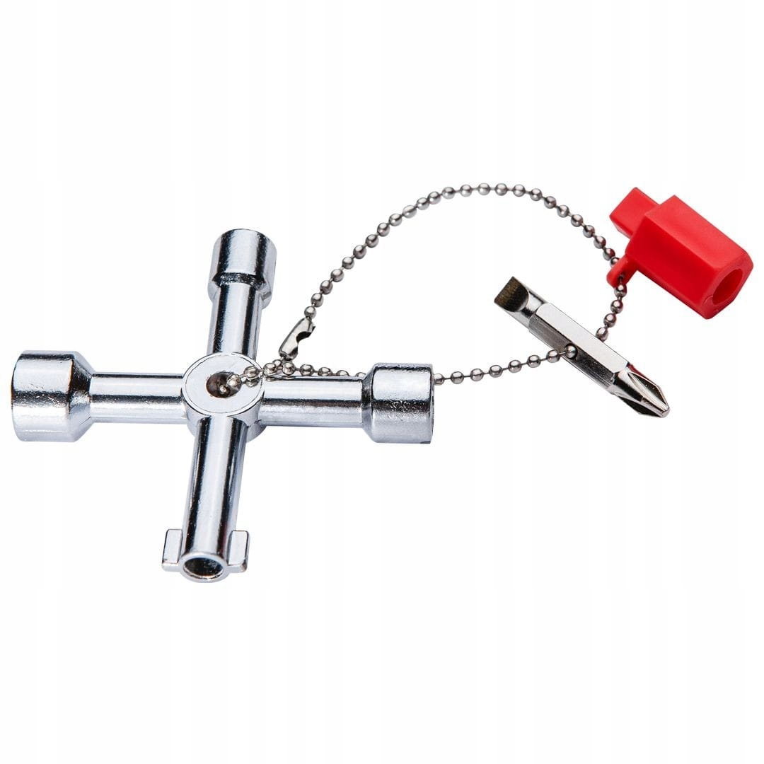Kluczyk uniwersalny do szafek 02-001 NEO na łańcuszku to niezbędne narzędzie w skrzynce każdego instalatora oraz konserwatora urządzeń technicznych. Klucz wyposażony jest w cztery uniwersalne końcówki do popularnych zamków szafek w trzech kształtach i czterech rozmiarach: