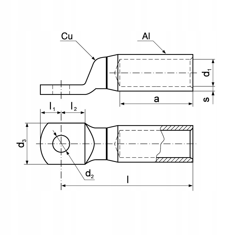 Końcówka szczelna ACK do kabli Al jedno- i wielodrutowych – przekrój żyły 95 mm2 se, przekrój żyły 70 mm2 rm/sm, pod śrubę M 10