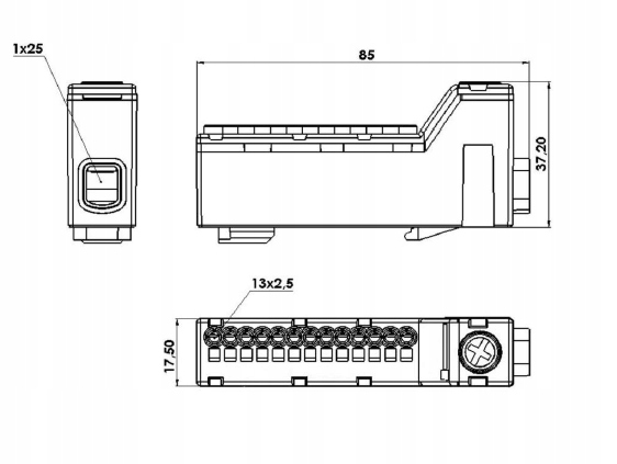 - Wejście: 1x 2,5-25 mm²; wyjście 13x 1,5-2,5 mm²