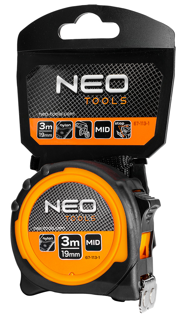 ⭐Miara zwijana stalowa 3 m x 19 mm, magnes 67-113-1 marki NEO to praktyczne narzędzie o długości 3 m i szerokości taśmy 19 mm, z dwiema praktycznymi blokadami zwijania taśmy.