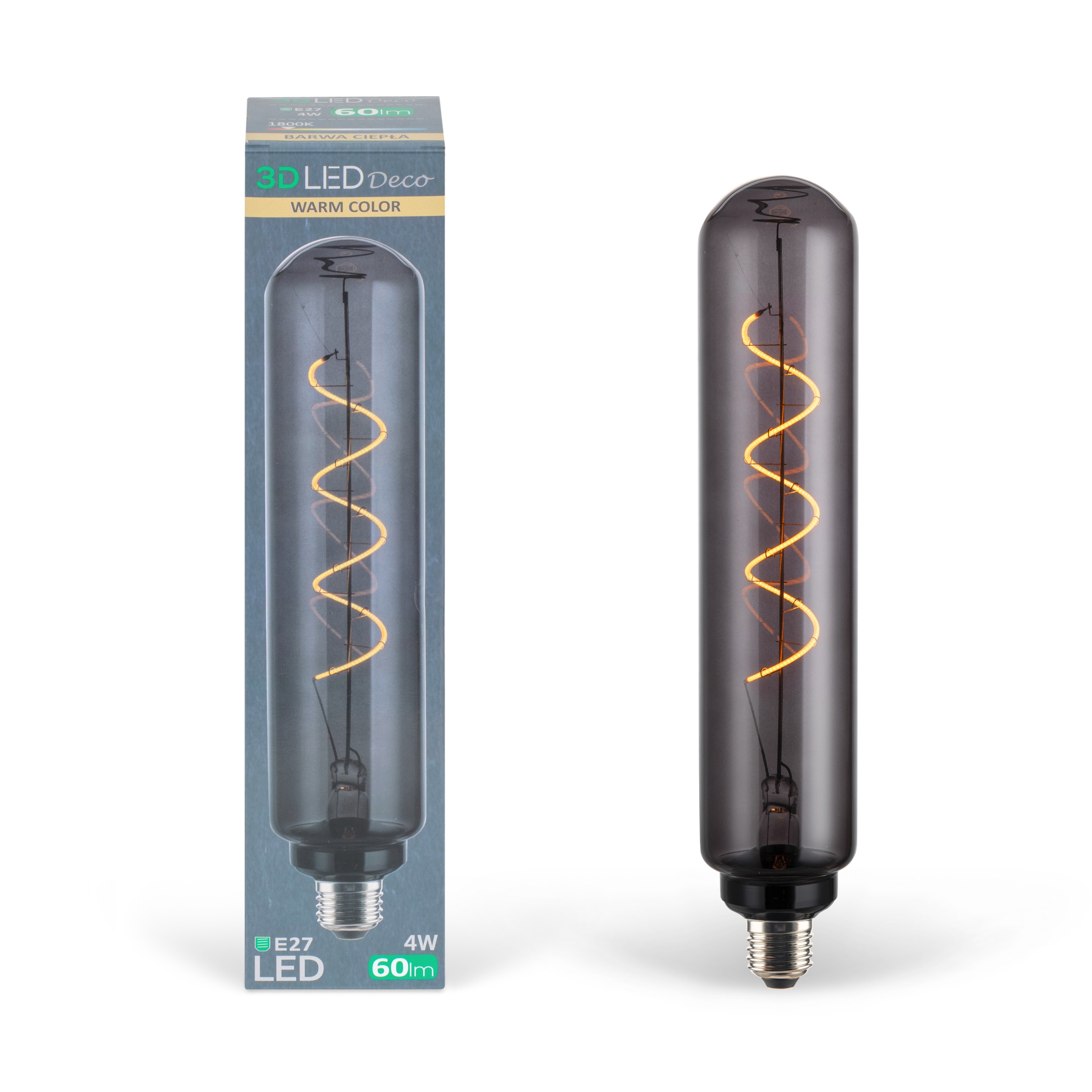Żarówka 3D LED DECO TUBE z przydymionym szkłem to idealne rozwiązanie dla miłośników stylu vintage i industrialnego. Smukła, cylindryczna forma w połączeniu ze spiralnym filamentem LED tworzy elegancki i nastrojowy efekt świetlny.