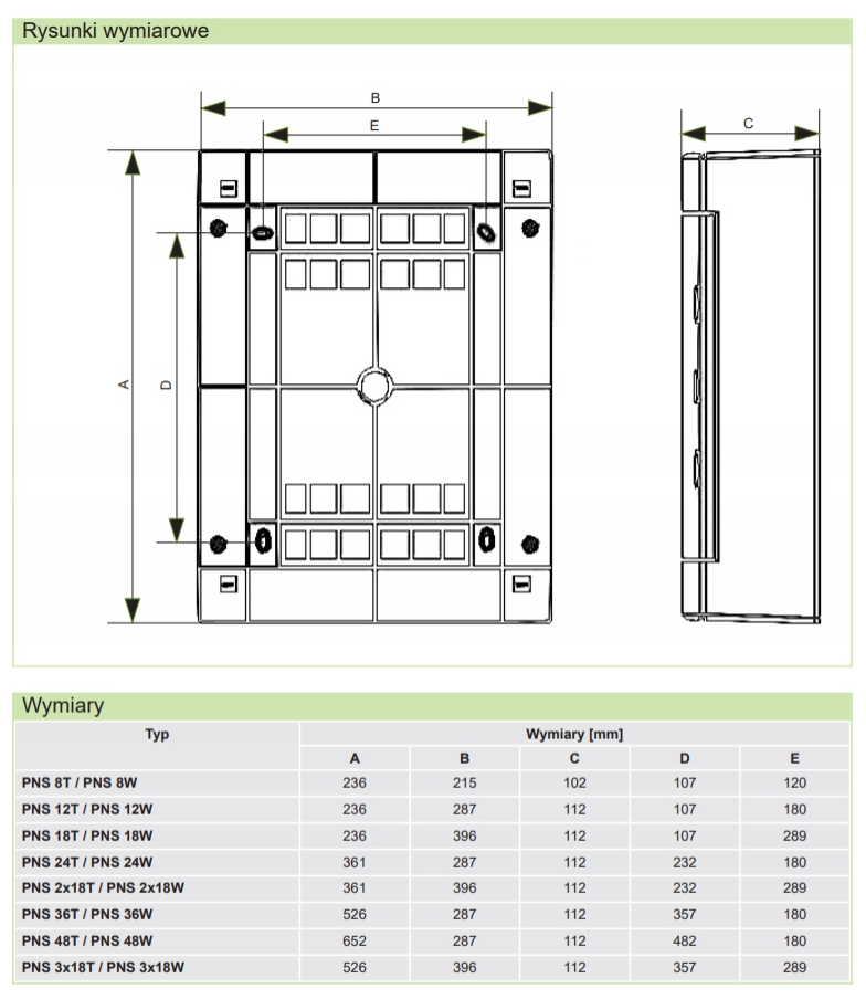 Obudowy instalacyjne PNS są przeznaczone głównie do zastosowań domowych, stopień ochrony IP40. Wersja PNS jest dostępna w jednej z czterech zaprojektowanych wersji od 4 do 72 modułów, z białymi lub przezroczystymi drzwiami. Dostawa składa się z obudowy, drzwi, szyn TH-35 mm, zacisków N + PE, przedniej pokrywy z wycięciami pod aparaty, zaślepki, elementów do montażu.
