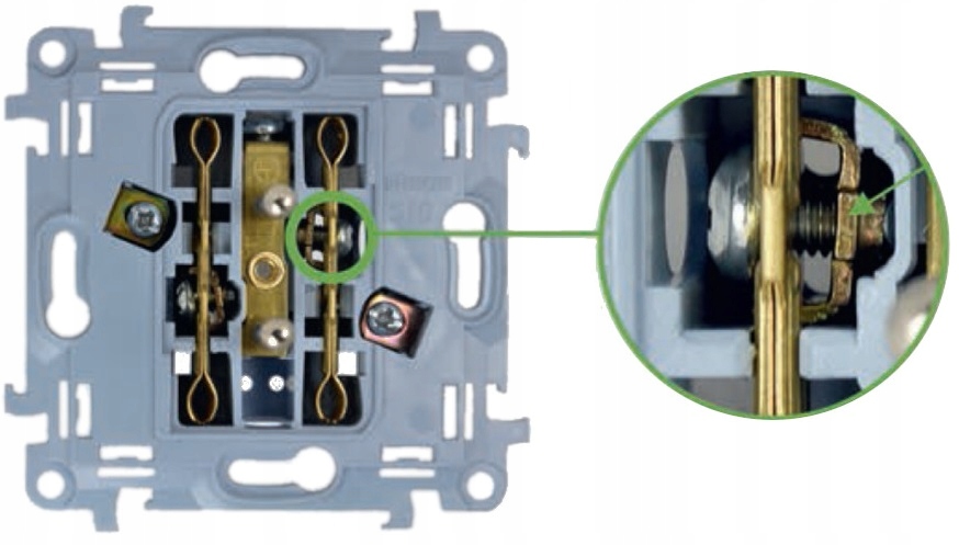 - WZMOCNIONE MOCOWANIE przewodów elektrycznych zapewnia profilowany zacisk dociskający przewód do szyn prądowych,