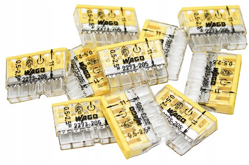 Uniwersalne złączki z zaciskiem służą do podłączania 5 odizolowanych przewodów o przekroju od 0,5 do 2,5 mm², bez użycia narzędzi. Jest to możliwe dzięki dźwigni, która w stanie podniesionym trwale dociska zacisk ku dołowi, aby instalator mógł oburącz podłączyć przewód.